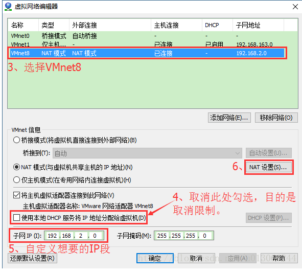 选择VMnet8–取消勾选使用本地DHCP–设置子网IP–网关IP设置(记住此处设置,后面要用到),如下图