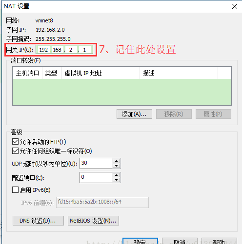 记录一下上面的网关地址,虚拟机中设置固定IP时需要用到,这里的网关IP也可以自行设置,只要网段一致即可。