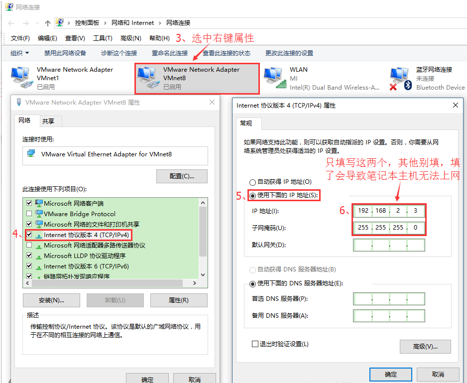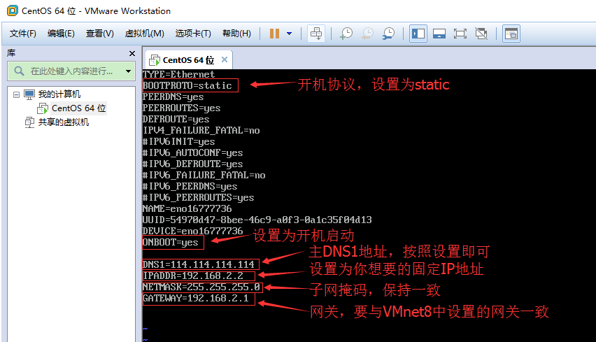 IPADDR=192.168.2.3 #你想要设置的固定IP,除VMware配置的子网IP、网关IP以及VMnet8设置的3个IP外,同网段 0-255之间都可以,自行设置