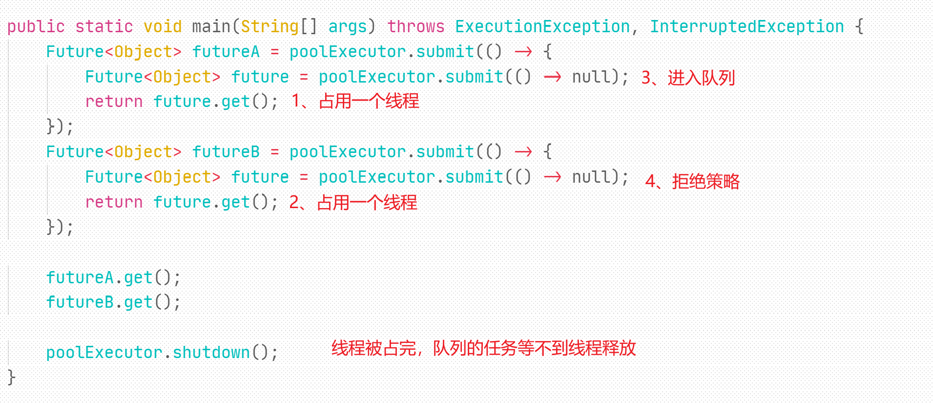 提交到线程池的任务如果相互依赖,多个任务也被同一线程池调度执行,A任务在等待B任务完成的同时,占用的线程不会结束,如果流量足够,线程池里的线程都被A任务占用完而不会结束,那么在任务队列的B任务永远不会有线程去执行,从而出现了线程饥饿锁的出现。