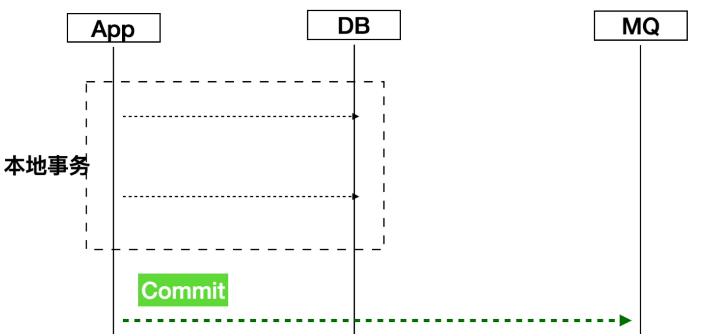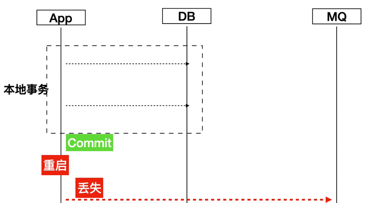 但是这并不是分布式事务的解决方案,因为在极端场景下,本地事务提交之后还没有发送消息,这个时候机器重启或者服务挂掉了,从理论上来说也是存在消息丢失的风险的。所以这个方案并不是一种分布式事务的解决方案,这里更多的侧重点是优化代码结构。