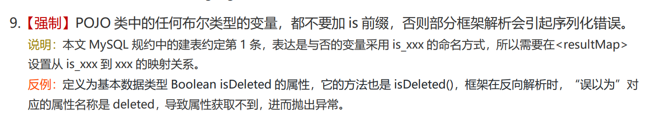对上面举的反例感觉有些怪,**基本数据类型Boolean isDeleted属性的Getter方法是isDeleted()**,手册应该写的有问题,印象中基本数据类型boolean是这样的,但是Boolean包装类型并不是如此,后面会对这里进行探索,坑很大。