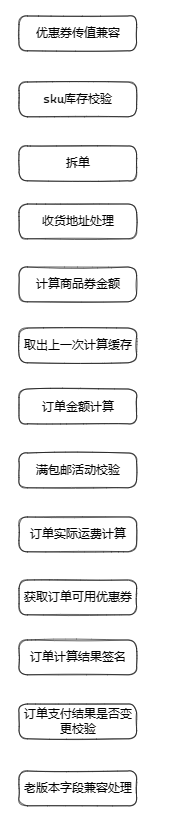 对于复杂度较高的代码,无论是进行代码的重构还是在此基础上进行功能的迭代,对于过程的分解是必不可少的。通过通篇阅读代码,整个订单计算的逻辑可以分解为几部分组成